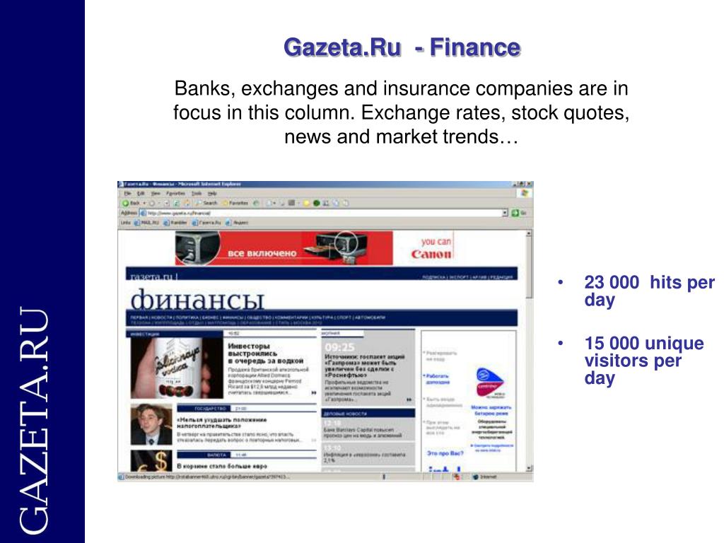 Gazeta.Ru - Finance Banks, exchanges and insurance companies are in focus in this column. Exchange rates, stock quotes, news and market trends… • 23 000 hits per day • 15 000 unique visitors per day