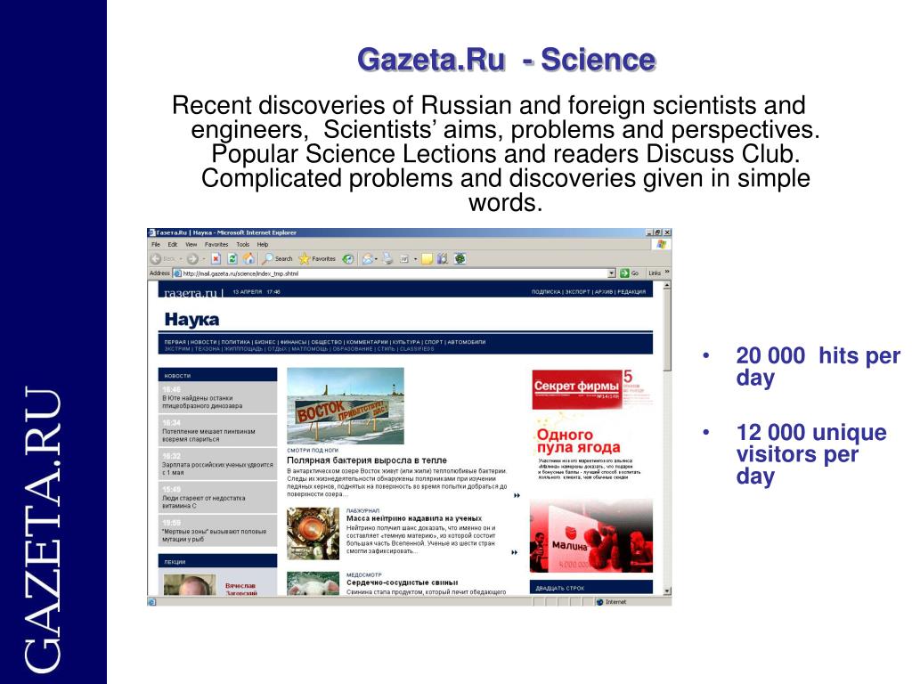 Gazeta.Ru - Science Recent discoveries of Russian and foreign scientists and engineers, Scientists’ aims, problems and perspectives. Popular Science Lections and readers Discuss Club. Complicated problems and discoveries given in simple words. • 20 000 hits per day • 12 000 unique visitors per day