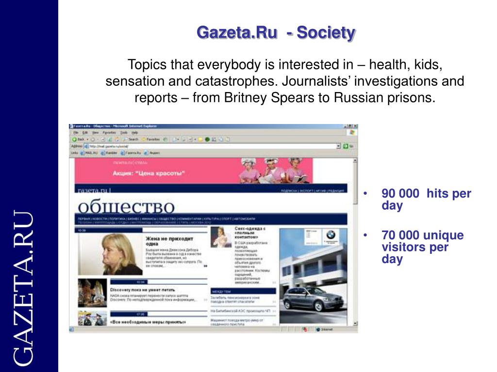 Gazeta.Ru - Society Topics that everybody is interested in – health, kids, sensation and catastrophes. Journalists’ investigations and reports – from Britney Spears to Russian prisons. • 90 000 hits per day • 70 000 unique visitors per day