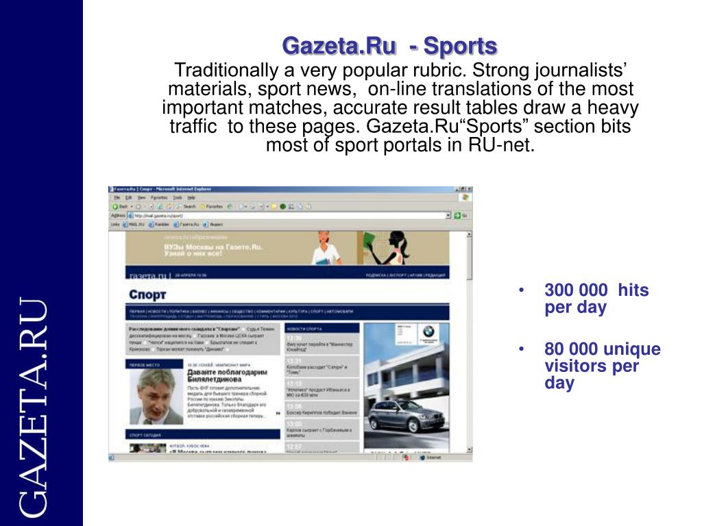 Gazeta.Ru - Sports Traditionally a very popular rubric. Strong journalists’ materials, sport news, on-line translations of the most important matches, accurateresult tables draw a heavy traffic to these pages.Gazeta.Ru“Sports” section bits most of sport portals in RU-net. • 300 000 hits per day • 80 000 unique visitors per day