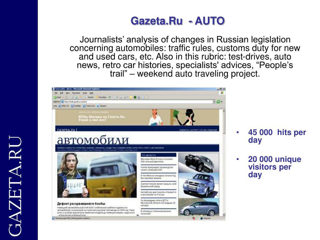 Gazeta.Ru - AUTO Journalists’ analysis of changes in Russian legislation concerning automobiles: traffic rules, customs duty for new and used cars, etc. Also in this rubric: test-drives, auto news, retro car histories, specialists' advices, “People’s trail” – weekend auto traveling project. • 45 000 hits per day • 20 000 unique visitors per day