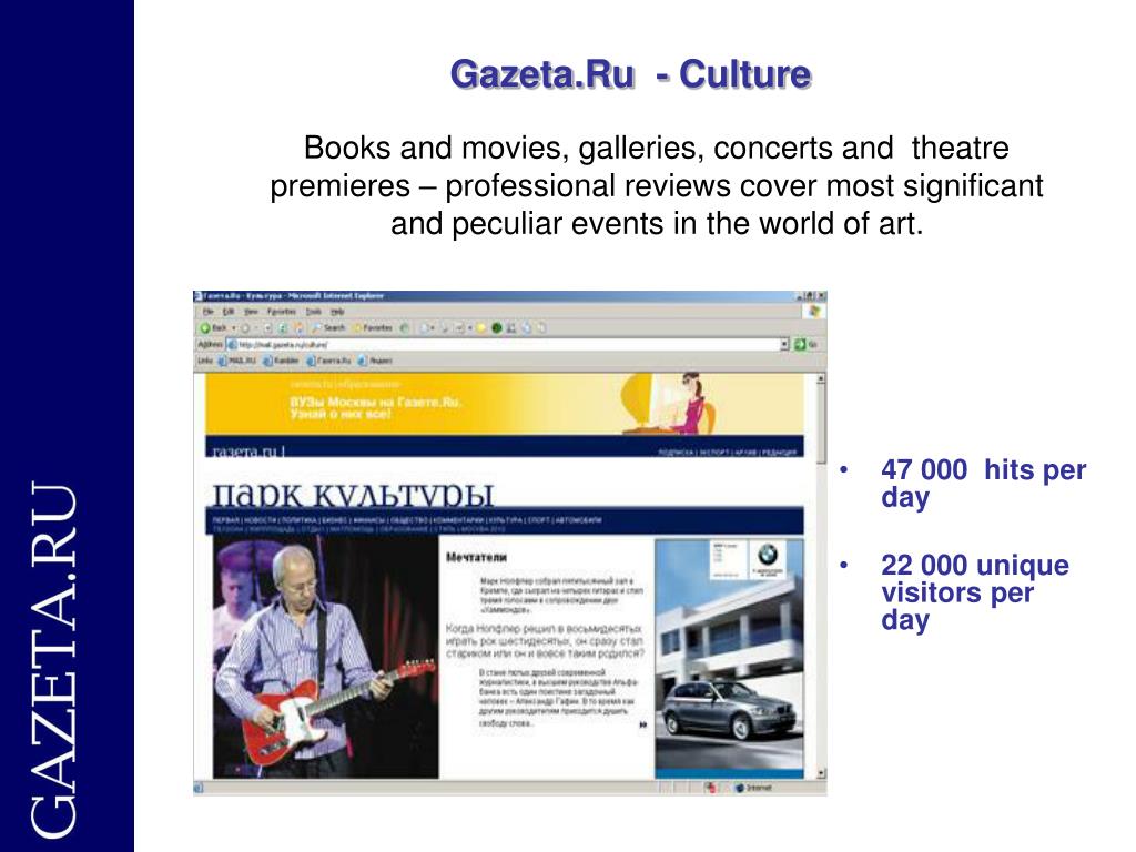 Gazeta.Ru - Culture Books and movies, galleries, concerts and theatre premieres – professional reviews cover most significant and peculiar events in the world of art. • 47 000 hits per day • 22 000 unique visitors per day