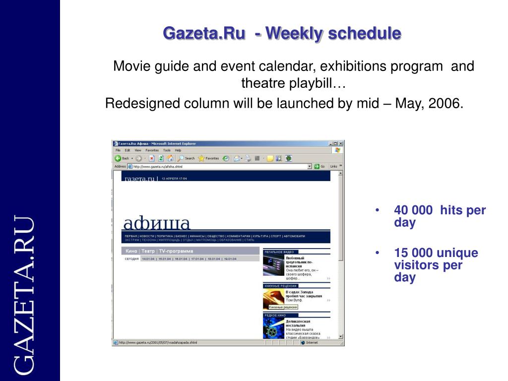 Gazeta.Ru - Weekly schedule Movie guide and event calendar, exhibitions program and theatre playbill… Redesigned column will be launched by mid – May, 2006. • 40 000 hits per day • 15 000 unique visitors per day
