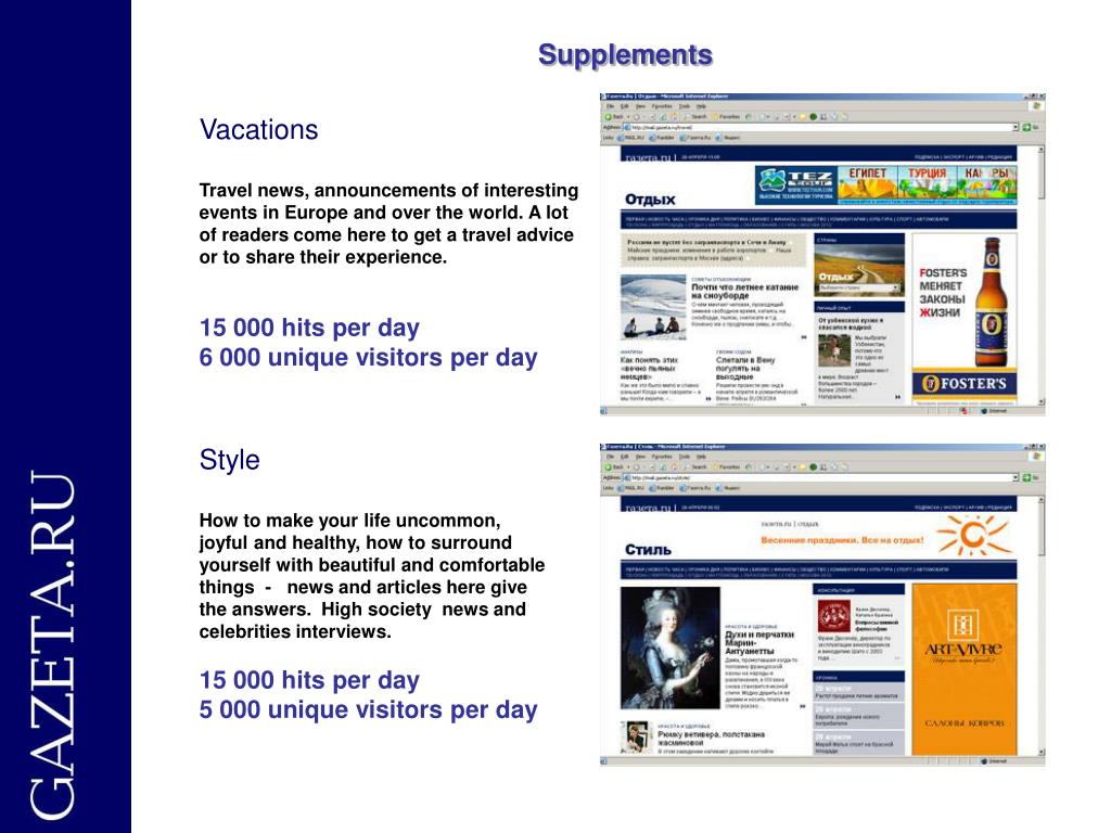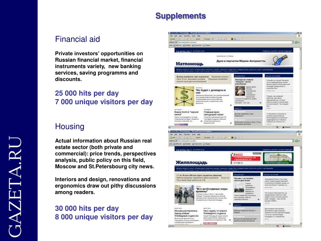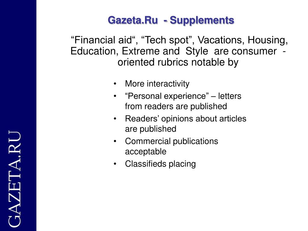 Gazeta.Ru - Supplements “Financial aid“, “Tech spot”, Vacations, Housing, Education, Extreme and Style are consumer - oriented rubrics notable by • More interactivity • “Personal experience” – letters from readers are published • Readers’ opinions about articles are published • Commercial publications acceptable • Classifieds placing