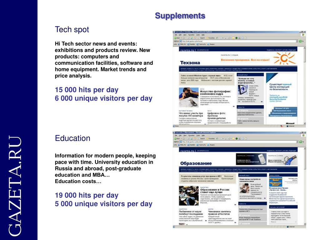 Supplements Tech spot Hi Tech sector news and events: exhibitions and products review. New products: computers and communication facilities, software and home equipment. Market trends and price analysis. 15 000 hits per day 6 000unique visitors per day Education Information for modern people, keeping pace with time. University education in Russia and abroad, post-graduate education and MBA… Education costs… 19 000 hits per day 5 000unique visitors per day