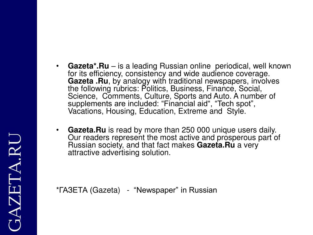 Gazeta*.Ru – is a leading Russian online periodical, well known for its efficiency, consistency and wide audience coverage. Gazeta .Ru, by analogy withtraditional newspapers, involves the following rubrics: Politics, Business, Finance, Social, Science, Comments, Culture, Sports and Auto. A number of supplements are included: “Financial aid“, “Tech spot”, Vacations, Housing, Education, Extreme and Style. • Gazeta.Ruis read by more than 250 000 unique users daily. Our readers represent the most active and prosperous part of Russian society, and that fact makes Gazeta.Rua very attractive advertising solution. *ГАЗЕТА (Gazeta) - “Newspaper” in Russian