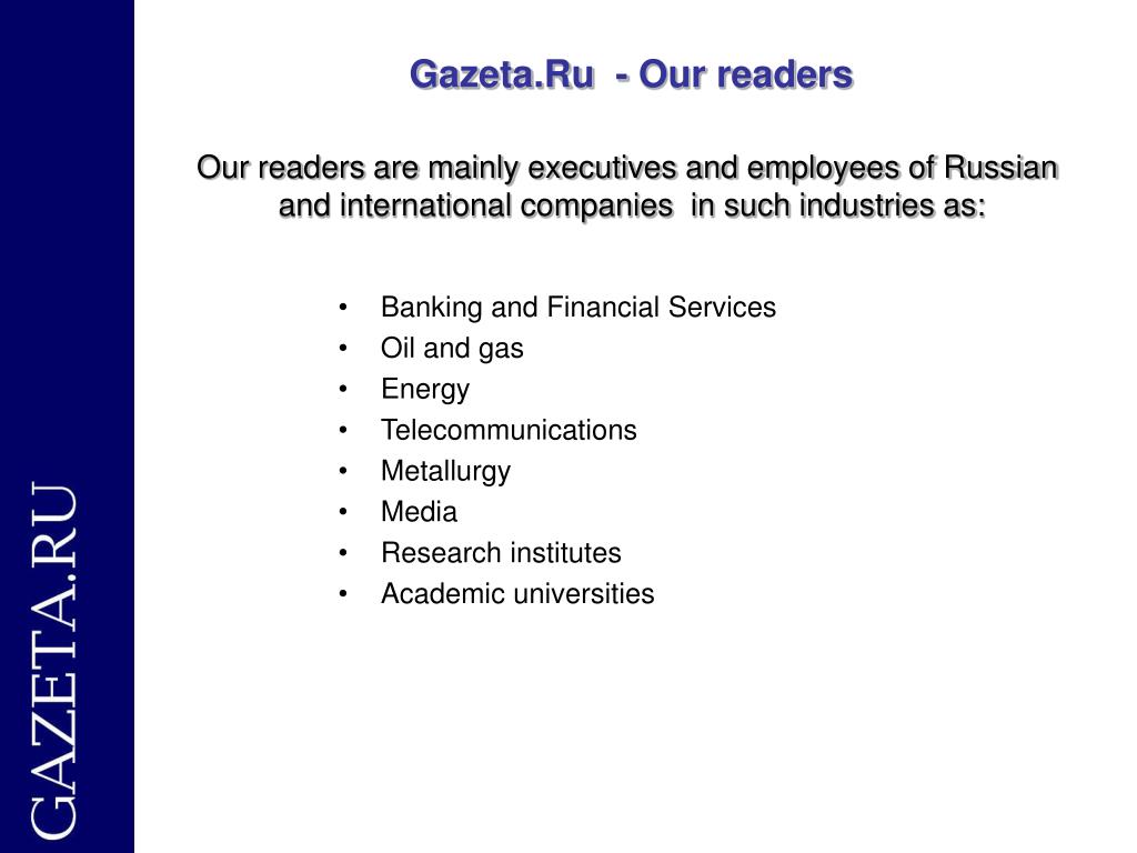 Gazeta.Ru - Our readers Our readers are mainly executives and employees of Russian and international companies in such industries as: • Banking and Financial Services • Oil and gas • Energy • Telecommunications • Metallurgy • Media • Research institutes • Academic universities