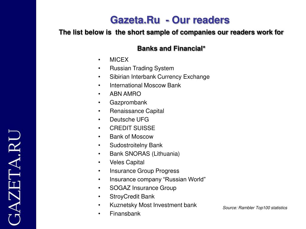 Gazeta.Ru - Our readers The list below is the short sample of companies our readers work for Banks and Financial* • MICEX • Russian Trading System • Sibirian Interbank Currency Exchange • International Moscow Bank • ABN AMRO • Gazprombank • Renaissance Capital • Deutsche UFG • CREDIT SUISSE • Bank of Moscow • Sudostroitelny Bank • Bank SNORAS (Lithuania) • Veles Capital • Insurance Group Progress • Insurance company “Russian World” • SOGAZ Insurance Group • StroyCredit Bank • Kuznetsky Most Investment bank • Finansbank Source: Rambler Top100 statistics