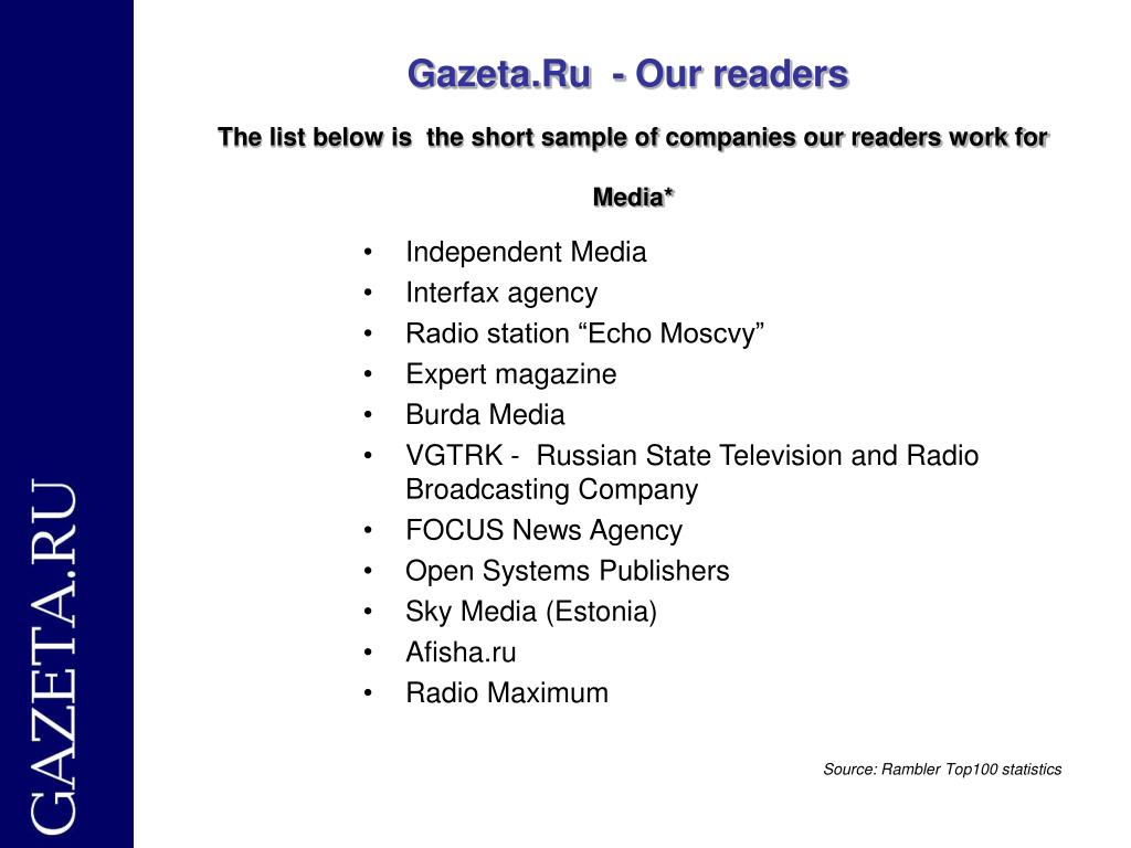 Gazeta.Ru - Our readers The list below is the short sample of companies our readers work for Media* • Independent Media • Interfax agency • Radio station “Echo Moscvy” • Expert magazine • Burda Media • VGTRK - Russian State Television and Radio Broadcasting Company • FOCUS News Agency • Open Systems Publishers • Sky Media (Estonia) • Afisha.ru • Radio Maximum Source: Rambler Top100 statistics