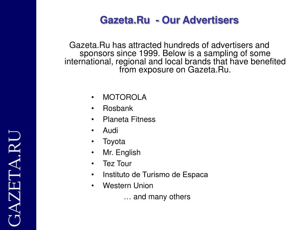 Gazeta.Ru - Our Advertisers Gazeta.Ru has attracted hundreds of advertisers and sponsors since 1999. Below is a sampling of some international, regional and local brands that have benefited from exposure on Gazeta.Ru. • MOTOROLA • Rosbank • Planeta Fitness • Audi • Toyota • Mr. English • Tez Tour • Instituto de Turismo de Espaсa • Western Union … and many others