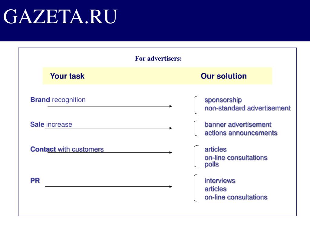 GAZETA.RU For advertisers: Brand recognitionsponsorship non-standard advertisement Sale increase banner advertisement actions announcements Contact with customersarticles on-line consultations polls PRinterviews articles on-line consultations Your taskOur solution