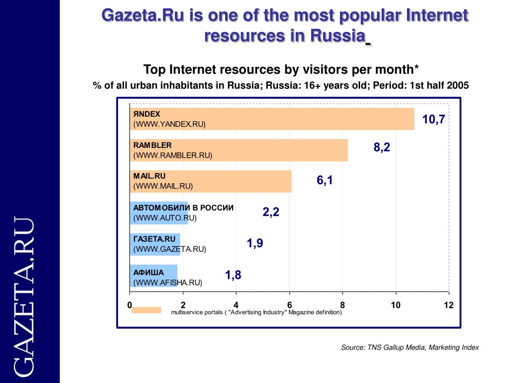 Gazeta.Ru is one of the most popular Internet resources in Russia Top Internet resources by visitors per month* % of all urban inhabitants in Russia; Russia: 16+ years old; Period: 1st half 2005 Source: TNS Gallup Media, Marketing Index
