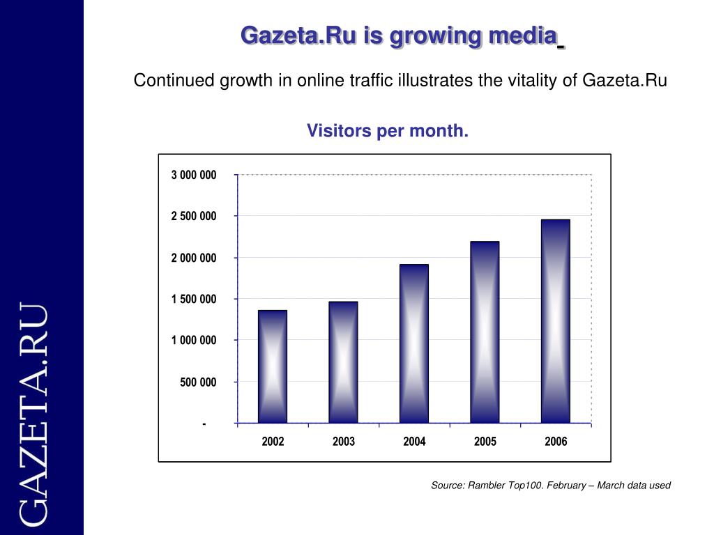 Gazeta.Ru is growing media Visitors per month. Continued growth in online traffic illustrates the vitality of Gazeta.Ru Source: Rambler Top100. February – March data used