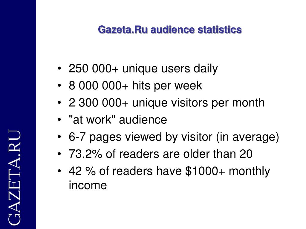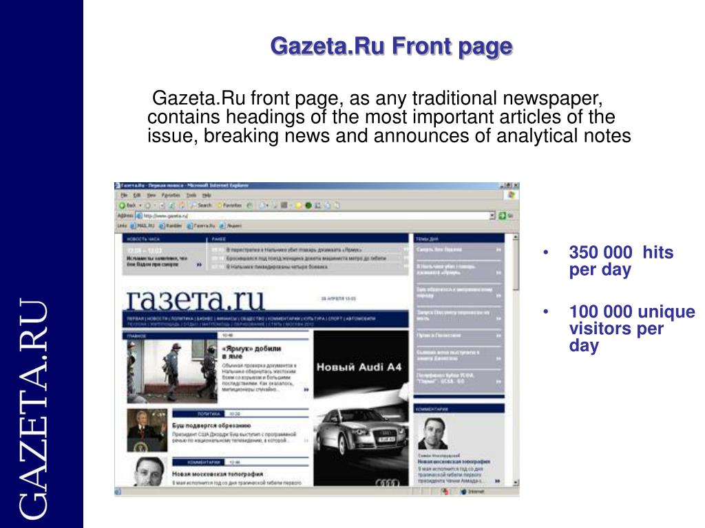 Gazeta.Ru Front page Gazeta.Rufront page, as any traditional newspaper, contains headings of the most important articles of the issue, breaking news and announces of analytical notes • 350 000 hits per day • 100 000 unique visitors per day