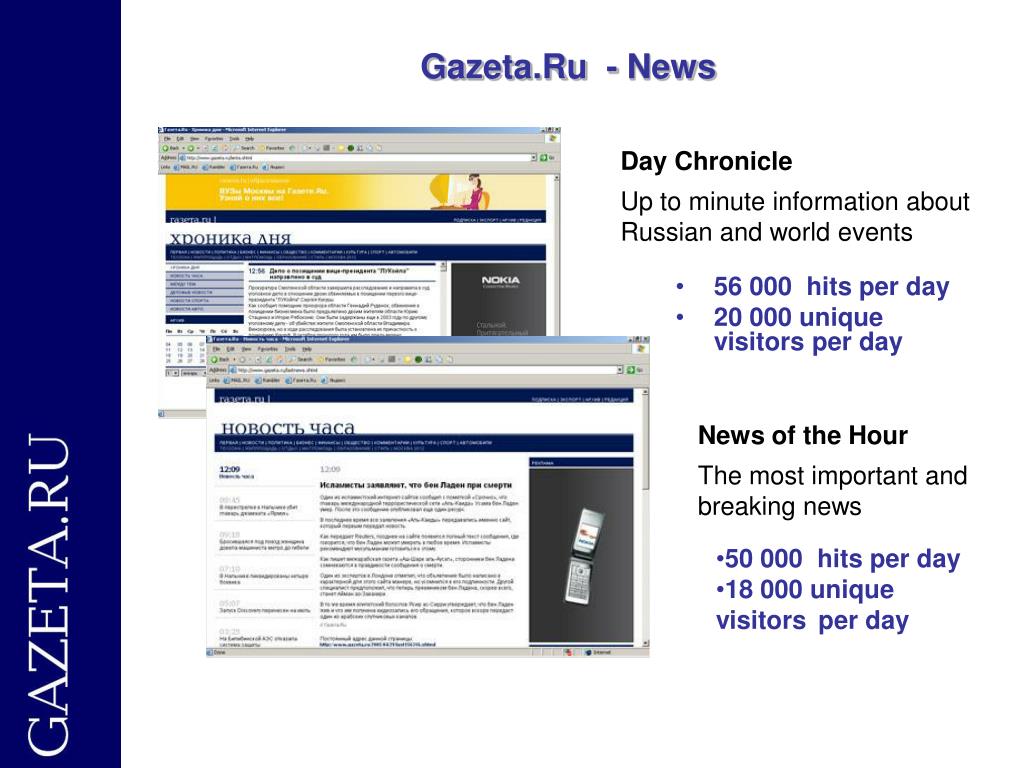 Gazeta.Ru - News DayChronicle Up to minute information about Russian and world events • 56 000 hits per day • 20 000 unique visitors per day News of the Hour The most important and breaking news • 50 000 hits per day • 18 000 unique visitors per day