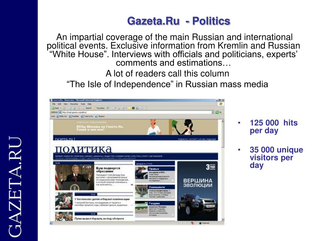 Gazeta.Ru - Politics An impartial coverage of the main Russian and international political events. Exclusive information from Kremlin and Russian “White House”. Interviews with officials and politicians, experts’ comments and estimations… A lot of readers call this column “The Isle of Independence” in Russian mass media • 125 000 hits per day • 35 000 unique visitors per day