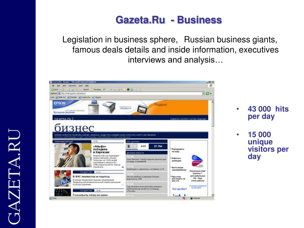 Gazeta.Ru - Business Legislation in business sphere, Russian business giants, famous deals details and inside information, executives interviews and analysis… • 43 000 hits per day • 15 000 unique visitors per day