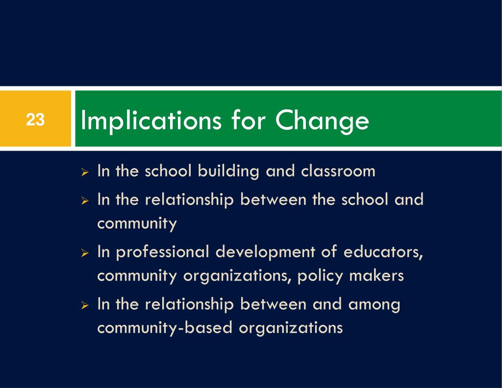 Implications for Change In the school building and classroom In the relationship between the school and community In professional development of educators, community organizations, policy makers In the relationship between and among community-based organizations