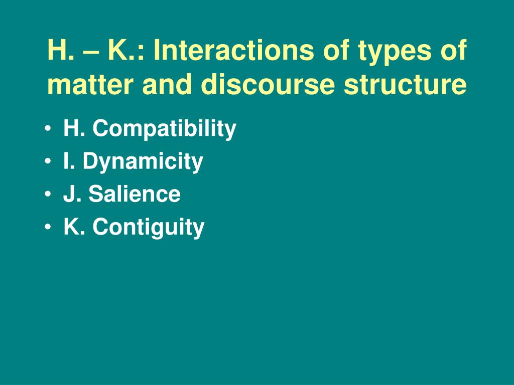 H. – K.: Interactions of types of matter and discourse structure • H. Compatibility • I. Dynamicity • J. Salience • K. Contiguity