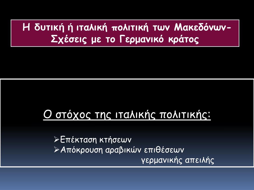 Η δυτική ή ιταλική πολιτική των Μακεδόνων- Σχέσεις με το Γερμανικό κράτος • Ο στόχος της ιταλικής πολιτικής: • Επέκταση κτήσεων • Απόκρουση αραβικών επιθέσεων • γερμανικής απειλής