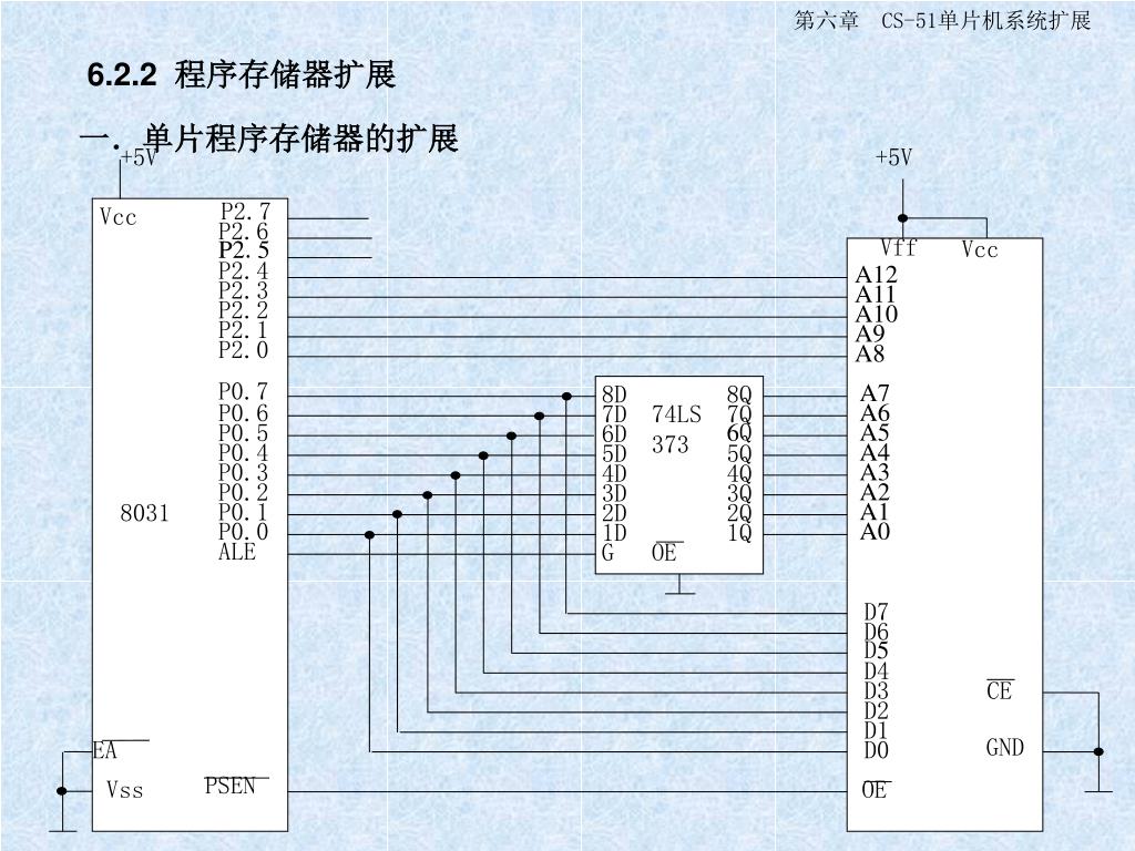 +5V +5V P2.7 Vcc P2.6 Vff Vcc P2.5 P2.4 A12 P2.3 A11 P2.2 A10 P2.1 A9 P2.0 A8 P0.7 8D 8Q A7 P0.6 7D 74LS 373 7Q A6 P0.5 6D 6Q A5 P0.4 5D 5Q A4 P0.3 4D 4Q A3 P0.2 3D 3Q A2 P0.1 8031 2D 2Q A1 P0.0 1D 1Q A0 ALE G OE D7 D6 D5 D4 D3 CE D2 D1 GND EA D0 PSEN Vss OE 6.2.2 程序存储器扩展 一.单片程序存储器的扩展