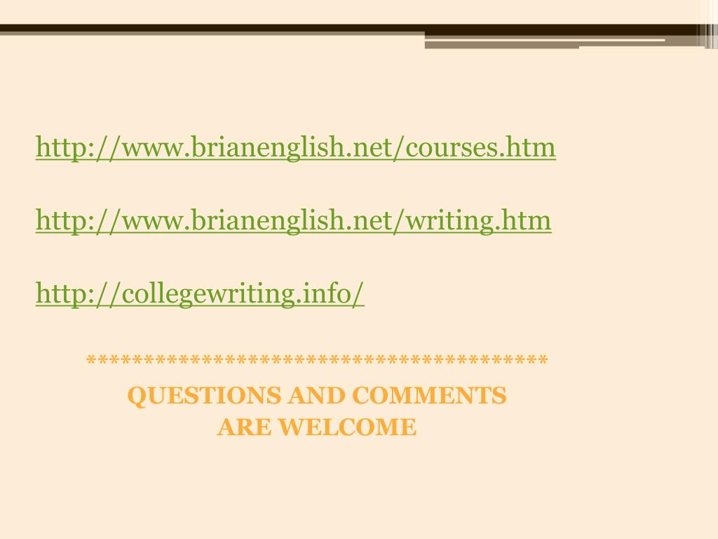 ADDITIONAL RESOURCES http://www.brianenglish.net/courses.htm http://www.brianenglish.net/writing.htm http://collegewriting.info/ **************************************** QUESTIONS AND COMMENTS ARE WELCOME