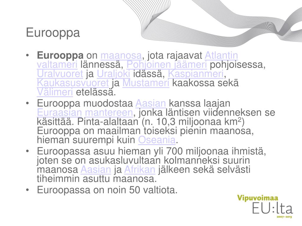 Eurooppa • Eurooppa on maanosa, jota rajaavat Atlantin valtameri lännessä, Pohjoinen jäämeri pohjoisessa, Uralvuoret ja Uraljoki idässä, Kaspianmeri, Kaukasusvuoret ja Mustameri kaakossa sekä Välimeri etelässä. • Eurooppa muodostaa Aasian kanssa laajan Euraasianmantereen, jonka läntisen viidenneksen se käsittää. Pinta-alaltaan (n. 10,3 miljoonaa km2) Eurooppa on maailman toiseksi pienin maanosa, hieman suurempi kuin Oseania. • Euroopassa asuu hieman yli 700 miljoonaa ihmistä, joten se on asukasluvultaan kolmanneksi suurin maanosa Aasian ja Afrikan jälkeen sekä selvästi tiheimmin asuttu maanosa. • Euroopassa on noin 50 valtiota.