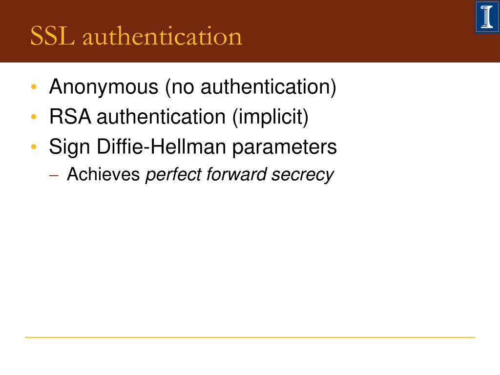 SSL authentication • Anonymous (no authentication) • RSA authentication (implicit) • Sign Diffie-Hellman parameters • Achieves perfect forward secrecy