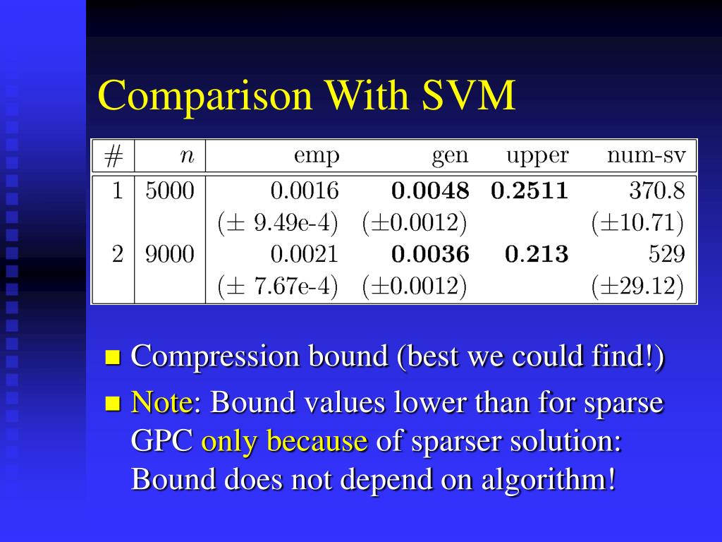 Comparison With SVM • Compression bound (best we could find!) • Note: Bound values lower than for sparse GPC onlybecause of sparser solution:Bound does not depend on algorithm!