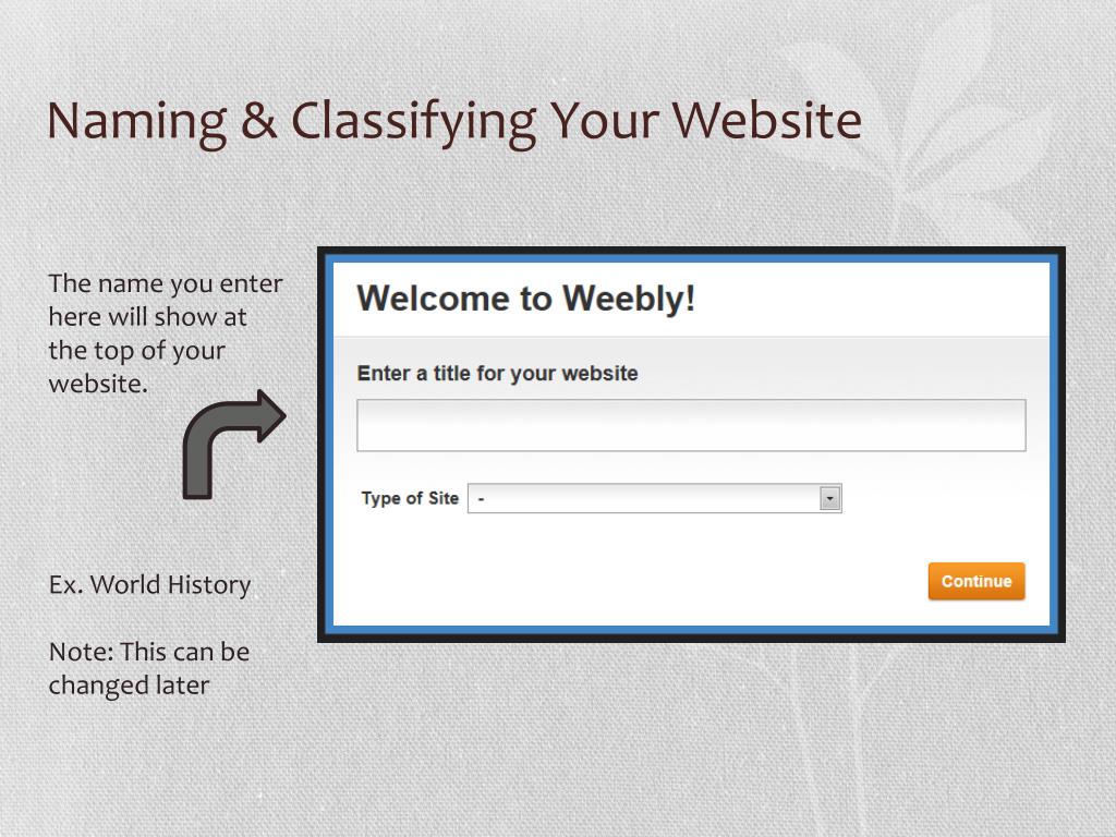 Naming & Classifying Your Website The name you enter here will show at the top of your website. Ex. World History Note: This can be changed later