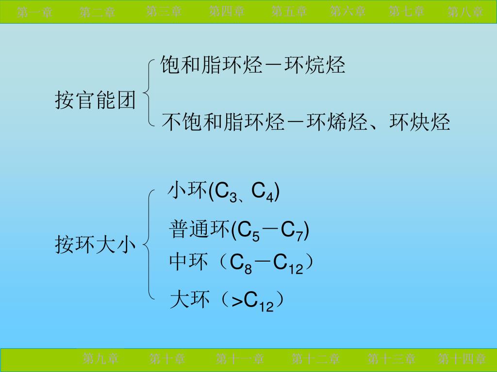 饱和脂环烃-环烷烃 按官能团 不饱和脂环烃-环烯烃、环炔烃 小环(C3、C4) 普通环(C5-C7) 按环大小 中环(C8-C12) 大环(>C12)