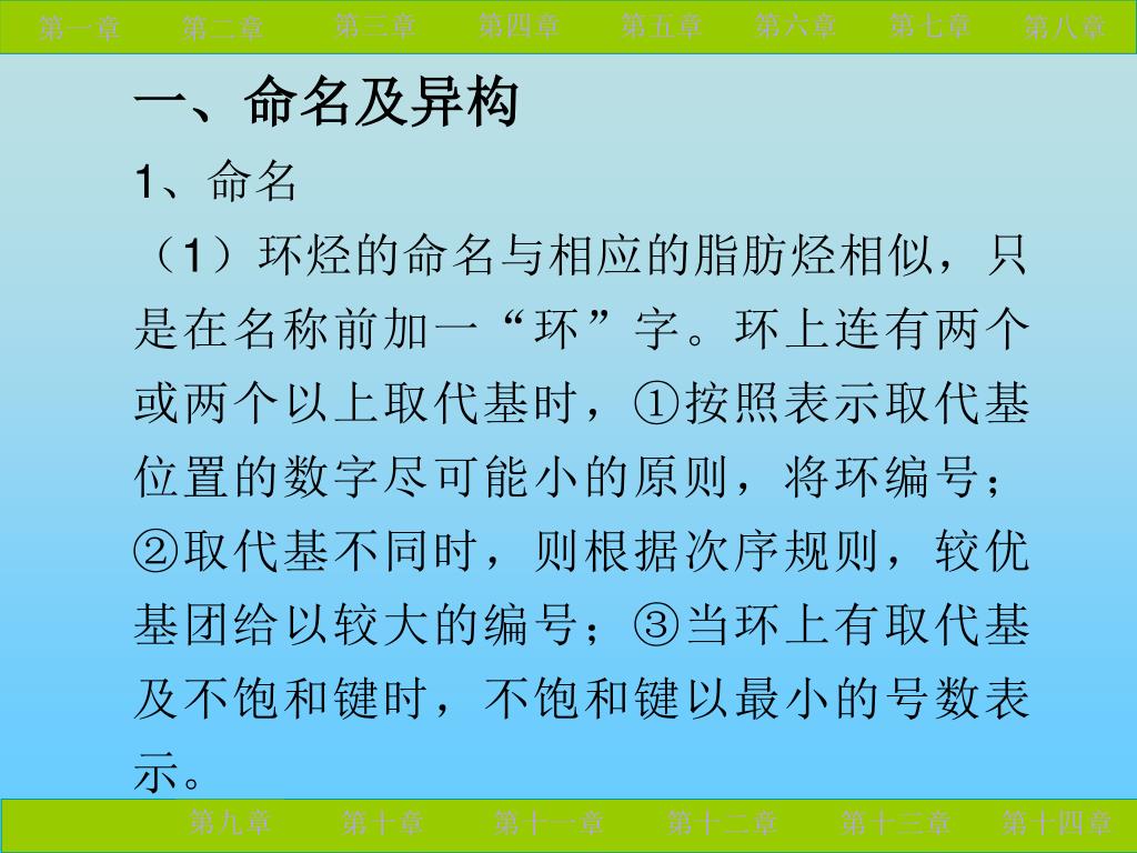 一、命名及异构 1、命名 (1)环烃的命名与相应的脂肪烃相似,只是在名称前加一“环”字。环上连有两个或两个以上取代基时,①按照表示取代基位置的数字尽可能小的原则,将环编号;②取代基不同时,则根据次序规则,较优基团给以较大的编号;③当环上有取代基及不饱和键时,不饱和键以最小的号数表示。