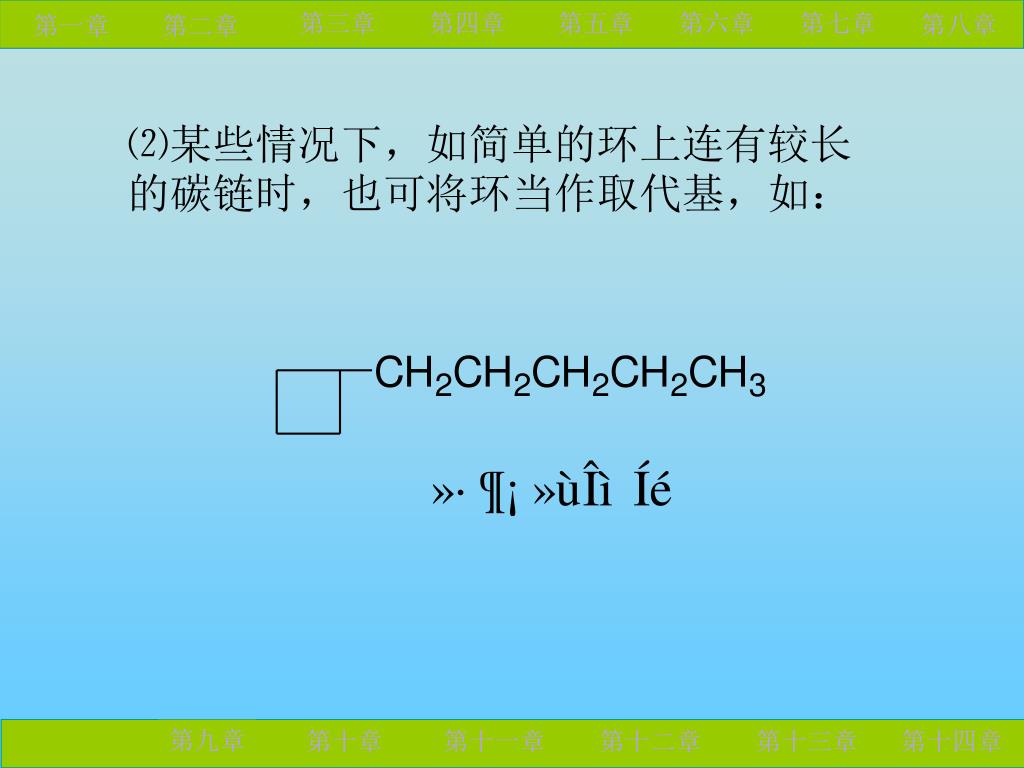 ⑷桥环的命名 ①从桥头碳开始编号,经过最大环到达 另一桥头,在经次大环回到第一个桥 头,最短的桥最后编号。 ②母体名称前冠以“环数”,后接[],方括中 表明环内 除桥头碳原子外的碳原子数 目,从大到小排列,之间用圆点分开。