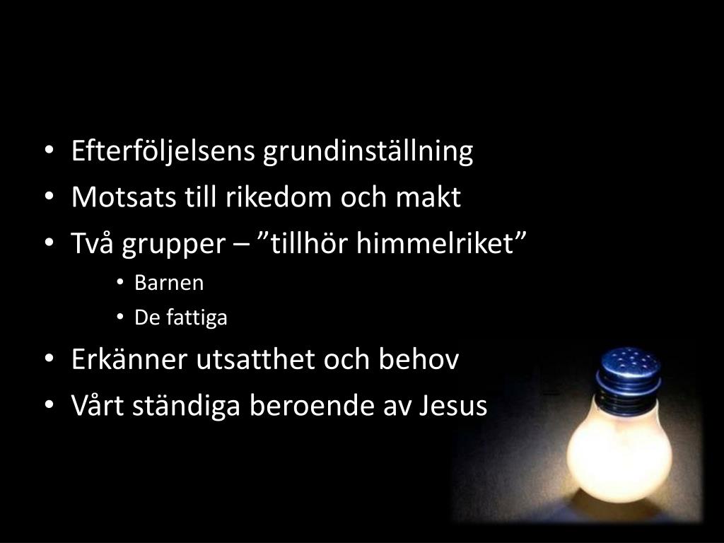 Efterföljelsens grundinställning • Motsats till rikedom och makt • Två grupper – ”tillhör himmelriket” • Barnen • De fattiga • Erkänner utsatthet och behov • Vårt ständiga beroende av Jesus