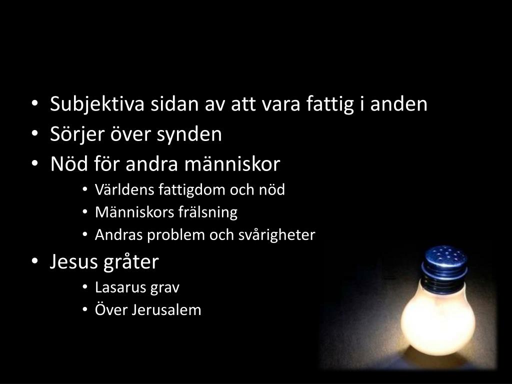 Subjektiva sidan av att vara fattig i anden • Sörjer över synden • Nöd för andra människor • Världens fattigdom och nöd • Människors frälsning • Andras problem och svårigheter • Jesus gråter • Lasarus grav • Över Jerusalem
