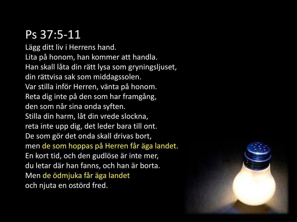 Ps 37:5-11 Lägg ditt liv i Herrens hand. Lita på honom, han kommer att handla. Han skall låta din rätt lysa som gryningsljuset, din rättvisa sak som middagssolen. Var stilla inför Herren, vänta på honom. Reta dig inte på den som har framgång, den som når sina onda syften. Stilla din harm, låt din vrede slockna, reta inte upp dig, det leder bara till ont. De som gör det onda skall drivas bort, men de som hoppas på Herren får äga landet. En kort tid, och den gudlöse är inte mer, du letar där han fanns, och han är borta. Men de ödmjuka får äga landet och njuta en ostörd fred.