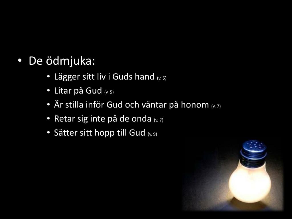 De ödmjuka: • Lägger sitt liv i Guds hand (v. 5) • Litar på Gud (v. 5) • Är stilla inför Gud och väntar på honom (v. 7) • Retar sig inte på de onda (v. 7) • Sätter sitt hopp till Gud (v. 9)