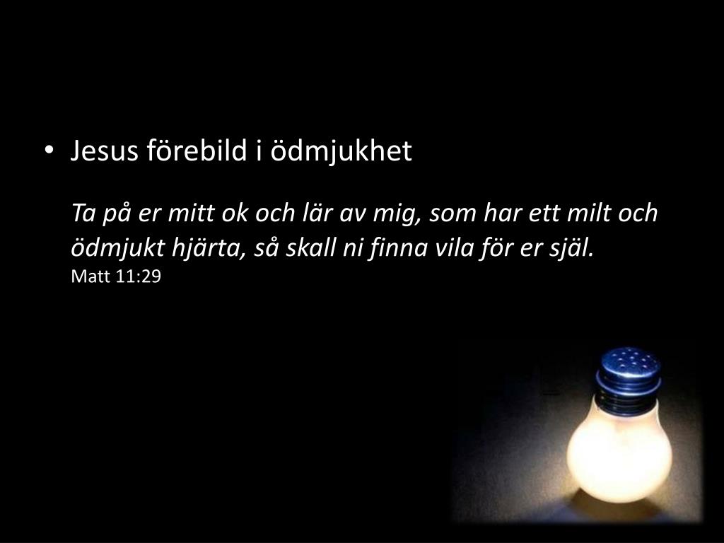 Jesus förebild i ödmjukhet Ta på er mitt ok och lär av mig, som har ett milt och ödmjukt hjärta, så skall ni finna vila för er själ. Matt 11:29