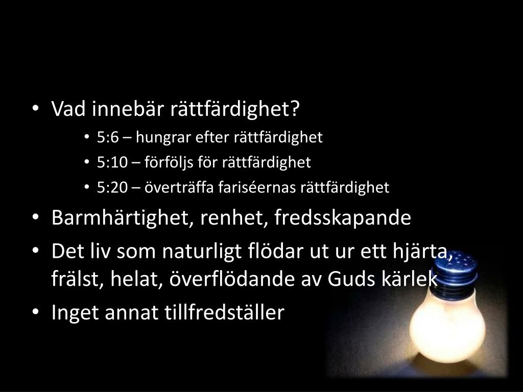 Vad innebär rättfärdighet? • 5:6 – hungrar efter rättfärdighet • 5:10 – förföljs för rättfärdighet • 5:20 – överträffa fariséernas rättfärdighet • Barmhärtighet, renhet, fredsskapande • Det liv som naturligt flödar ut ur ett hjärta, frälst, helat, överflödande av Guds kärlek • Inget annat tillfredställer