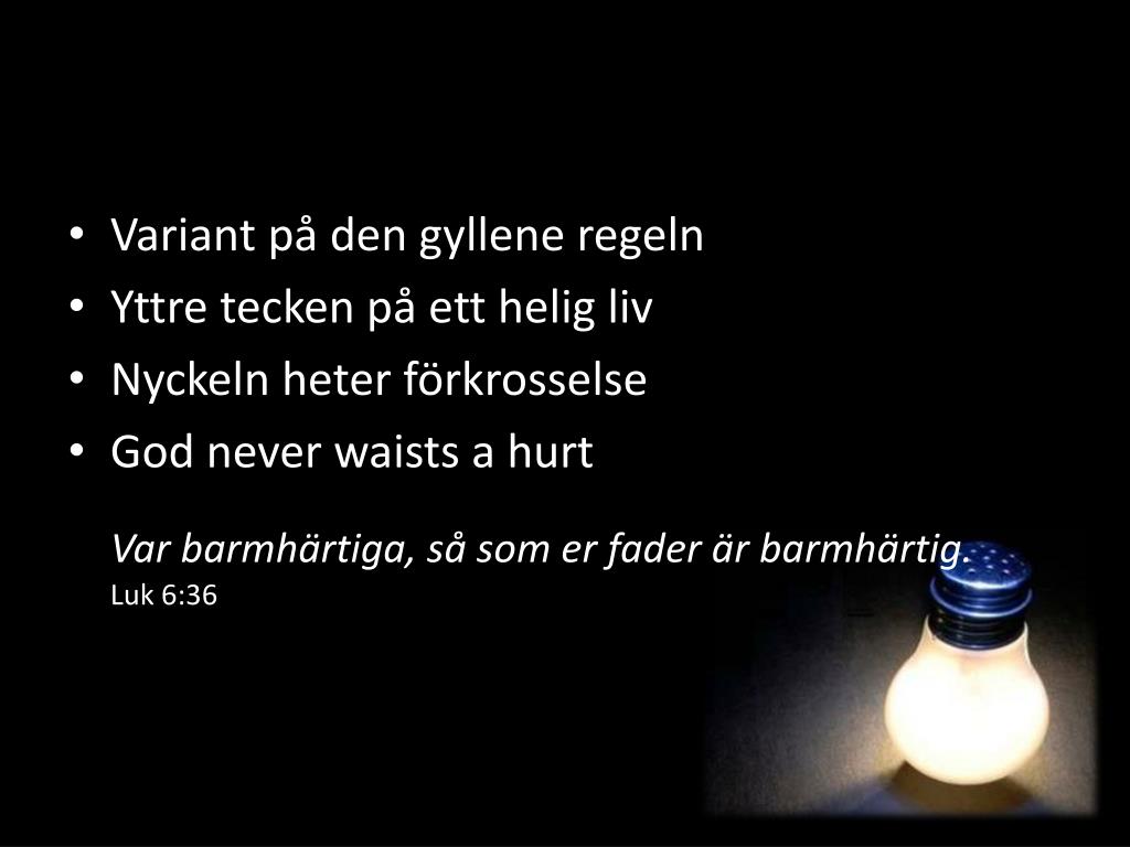 Variant på den gyllene regeln Yttre tecken på ett helig liv Nyckeln heter förkrosselse God neverwaists a hurt Var barmhärtiga, så som er fader är barmhärtig. Luk 6:36