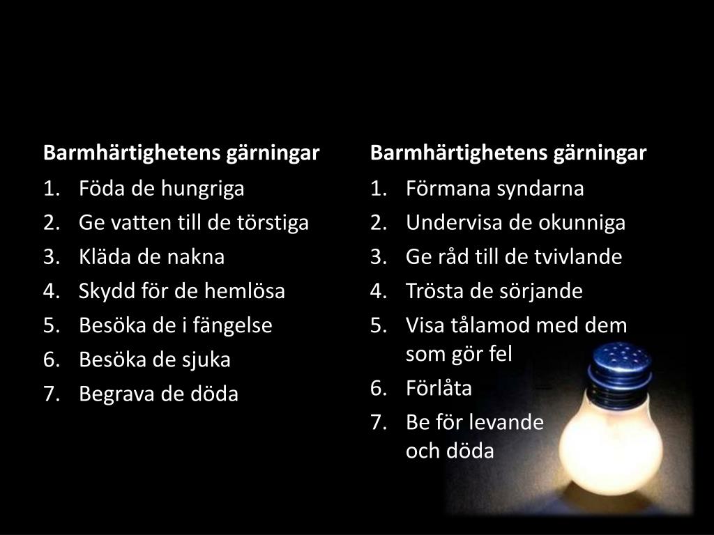 Barmhärtighetens gärningar Barmhärtighetens gärningar Förmana syndarna Undervisa de okunniga Ge råd till de tvivlande Trösta de sörjande Visa tålamod med dem som gör fel Förlåta Be för levande och döda • Föda de hungriga • Ge vatten till de törstiga • Kläda de nakna • Skydd för de hemlösa • Besöka de i fängelse • Besöka de sjuka • Begrava de döda