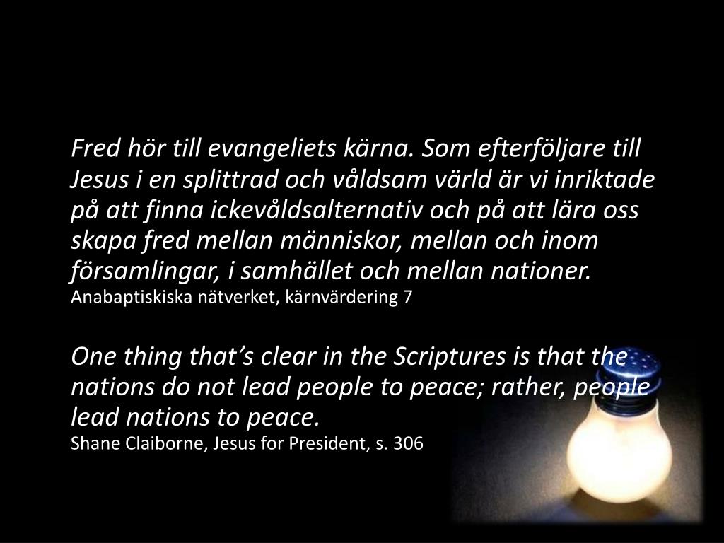 Fred hör till evangeliets kärna. Som efterföljare till Jesus i en splittrad och våldsam värld är vi inriktade på att finna ickevåldsalternativ och på att lära oss skapa fred mellan människor, mellan och inom församlingar, i samhället och mellan nationer. Anabaptiskiska nätverket, kärnvärdering 7 One thingthat’sclear in the Scriptures is that the nations do not leadpeople to peace; rather, peoplelead nations to peace. Shane Claiborne, Jesus for President, s. 306