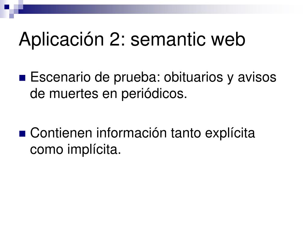 Aplicación 2: semantic web • Escenario de prueba: obituarios y avisos de muertes en periódicos. • Contienen información tanto explícita como implícita.