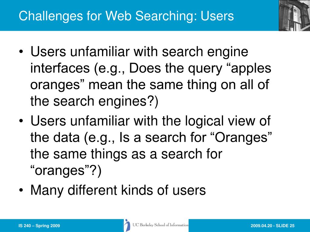 Challenges for Web Searching: Users • Users unfamiliar with search engine interfaces (e.g., Does the query “apples oranges” mean the same thing on all of the search engines?) • Users unfamiliar with the logical view of the data (e.g., Is a search for “Oranges” the same things as a search for “oranges”?) • Many different kinds of users