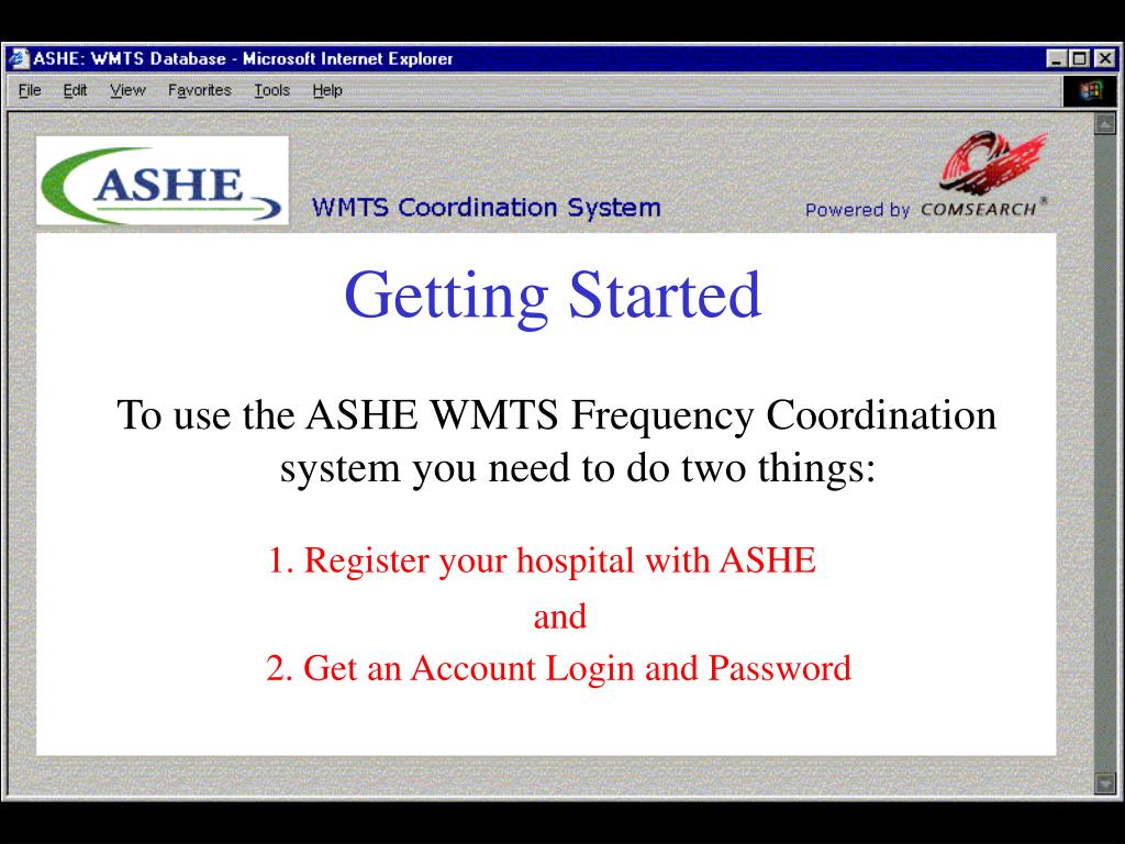 1. Register your hospital with ASHE and Getting Started To use the ASHE WMTS Frequency Coordination system you need to do two things: 2. Get an Account Login and Password