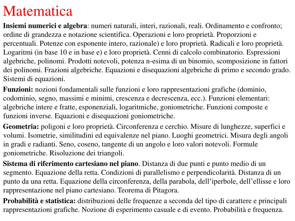 Matematica Insiemi numerici e algebra: numeri naturali, interi, razionali, reali. Ordinamento e confronto; ordine di grandezza e notazione scientifica. Operazioni e loro proprietà. Proporzioni e percentuali. Potenze con esponente intero, razionale) e loro proprietà. Radicali e loro proprietà. Logaritmi (in base 10 e in base e) e loro proprietà. Cenni di calcolo combinatorio. Espressioni algebriche, polinomi. Prodotti notevoli, potenza n-esima di un binomio, scomposizione in fattori dei polinomi. Frazioni algebriche. Equazioni e disequazioni algebriche di primo e secondo grado. Sistemi di equazioni. Funzioni: nozioni fondamentali sulle funzioni e loro rappresentazioni grafiche (dominio, codominio, segno, massimi e minimi, crescenza e decrescenza, ecc.). Funzioni elementari: algebriche intere e fratte, esponenziali, logaritmiche, goniometriche. Funzioni composte e funzioni inverse. Equazioni e disequazioni goniometriche. Geometria: poligoni e loro proprietà. Circonferenza e cerchio. Misure di lunghezze, superfici e volumi. Isometrie, similitudini ed equivalenze nel piano. Luoghi geometrici. Misura degli angoli in gradi e radianti. Seno, coseno, tangente di un angolo e loro valori notevoli. Formule goniometriche. Risoluzione dei triangoli. Sistema di riferimento cartesiano nel piano. Distanza di due punti e punto medio di un segmento. Equazione della retta. Condizioni di parallelismo e perpendicolarità. Distanza di un punto da una retta. Equazione della circonferenza, della parabola, dell’iperbole, dell’ellisse e loro rappresentazione nel piano cartesiano. Teorema di Pitagora. Probabilità e statistica: distribuzioni delle frequenze a seconda del tipo di carattere e principali rappresentazioni grafiche. Nozione di esperimento casuale e di evento. Probabilità e frequenza.