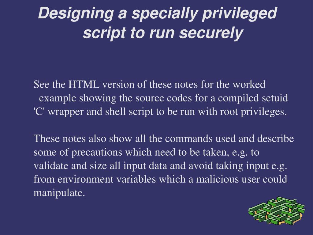 See the HTML version of these notes for the worked example showing the source codes for a compiled setuid 'C' wrapper and shell script to be run with root privileges. These notes also show all the commands used and describe some of precautions which need to be taken, e.g. to validate and size all input data and avoid taking input e.g. from environment variables which a malicious user could manipulate. Designing a specially privileged script to run securely