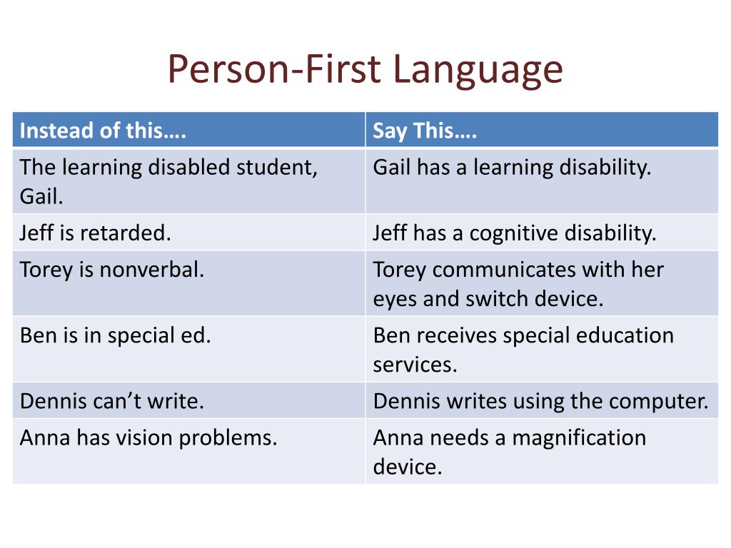 Session Targets: • Use person-first language when describing students. • Use the Individualized Education Plan (IEP) to support individual students’ strengths and needs.