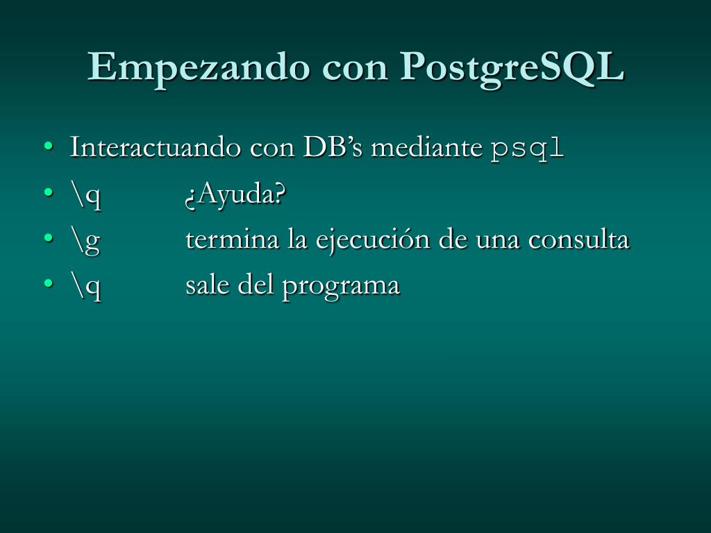 Empezando con PostgreSQL • Interactuando con DB’s mediante psql • \q ¿Ayuda? • \g termina la ejecución de una consulta • \q sale del programa