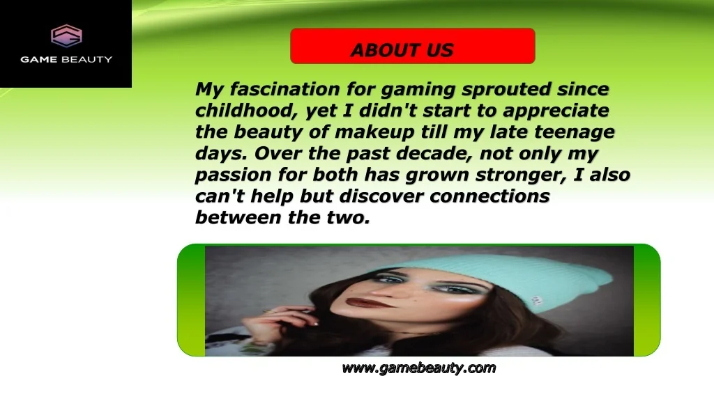 ABOUT US My fascination for gaming sprouted since childhood, yet I didn't start to appreciate the beauty of makeup till my late teenage days. Over the past decade, not only my passion for both has grown stronger, I also can't help but discover connections between the two. www.gamebeauty.com
